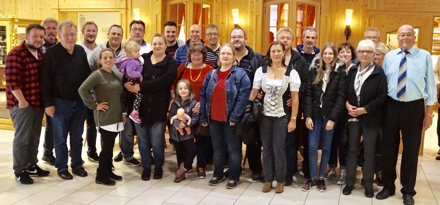 Das Wetter war den ganzen Tag TOP, aber in Feldstetten wurden wir mit Blitz und Donner begrüßt. Aber nicht nur das schlechte Wetter hat uns erwartet, sondern auch der Thomas hat sich noch mit seiner Silke zu uns gesellt, das hat uns sehr gefreut, klasse Aktion. Das Essen in der Post war vorbestellt und daher ging alles ratzfatz. Das Essen war erfahrungsgemäß lecker, die Bedienung war erstklassig und wir waren alle rundum satt und zufrieden, es gab natürlich einen in der Gruppe dem war die Portion zu klein und er stand hungrig vom Tisch auf, ihr habt Verständnis, dass ich keinen Namen nennen werde. Als krönender Abschluss wurde noch schnell ein Gruppenbild geschossen, dem Busfahrer ein Dankeschön dafür und dann ging es auch schon wieder zurück an den Start der Reise nach Nürtingen.