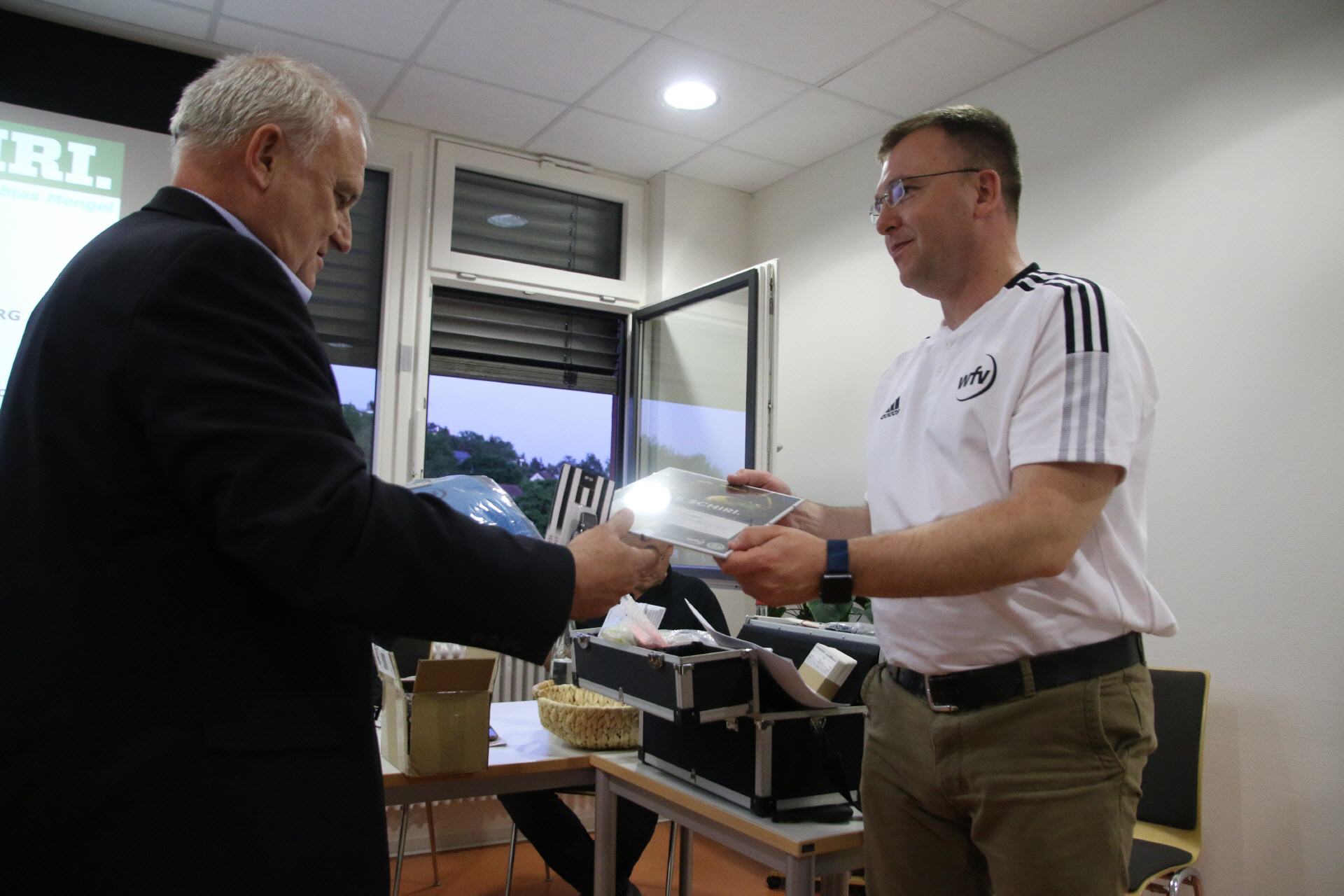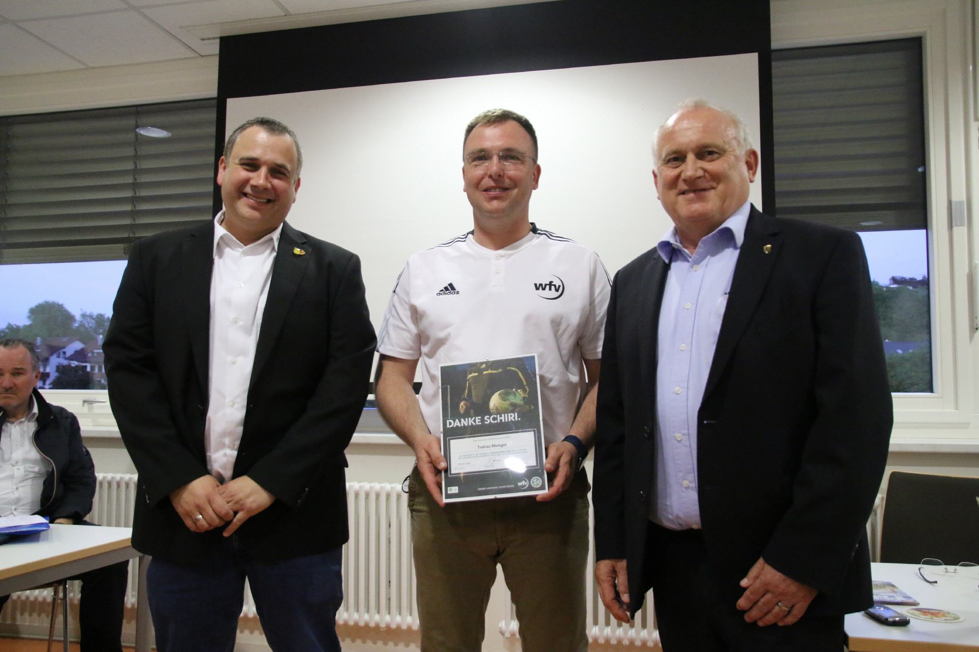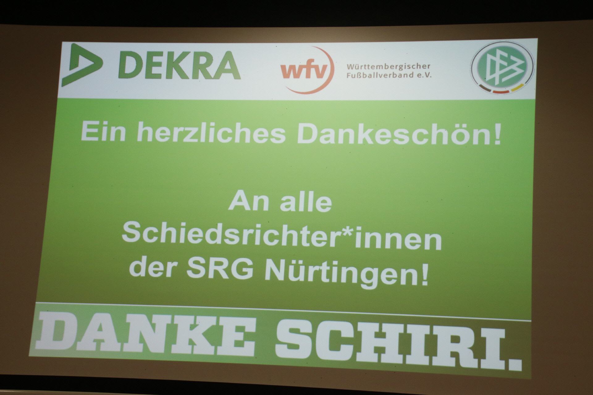 Unter dem Motto DANKE SCHIRI werden Unparteiische ausgezeichnet, die durch ihr besonderes Engagement auf und neben dem Spielfeld auf sich aufmerksam gemacht haben. Gewürdigt werden insgesamt 29 Personen, die sich beispielsweise durch ihre Einsatzbereitschaft, ihre Aktivität bei der Werbung, Ausbildung und Betreuung neuer Schiedsrichter*innen oder besonderes sportliches und soziales Engagement verdient gemacht haben. In der Gruppe Nürtingen waren das die Kameradin Natalie Bloss und der Kamerad Tobias Mengel die für den Bezirk Neckar/Fils gemeldet wurden. Tobias wurde Sieger bei den U50 und Natalie Bloss holte sich nicht nur den Sieg im Bezirk bei den Frauen, sondern Sie wurde auch Landessiegerin und durfte somit nach Frankfurt zu einem Galaabend in die DFB Zentrale. Coronabedingt wurde die Ehrung zum Sieg 2020 immer wieder verschoben, aber heute war es endlich möglich und so konnte die Ehrung durch Harald Müller nach der aktiven Schulung bei der TGN durchgeführt werden. Nochmals herzlichen Glückwunsch an die Gewinner.
