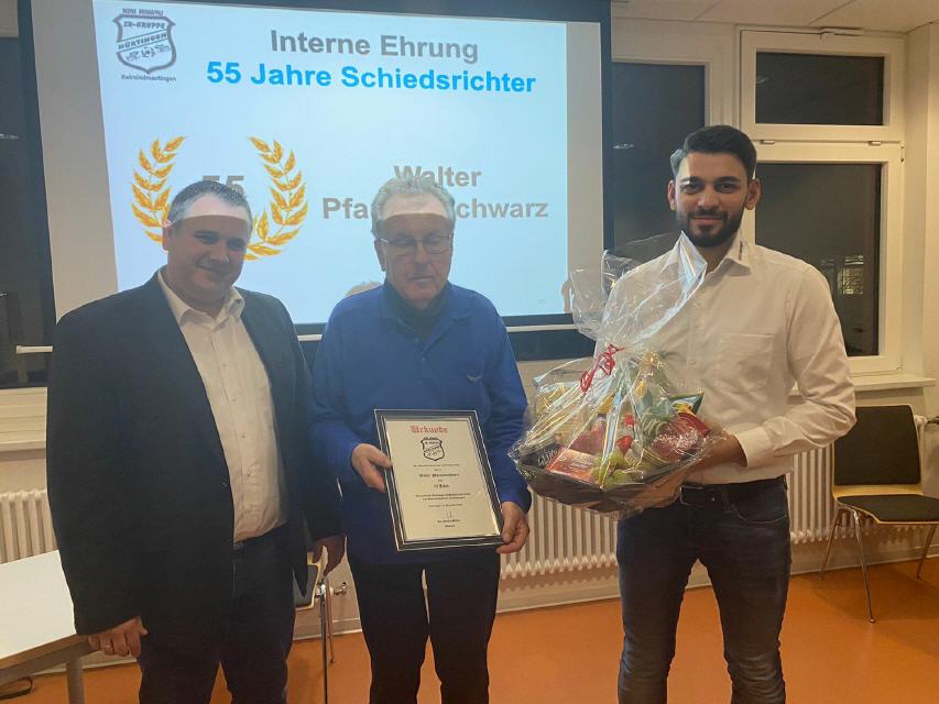 Traditionell führt die Schiedsrichtergruppe Nürtingen die Ehrungen für verdiente Schiedsrichter alljährlich im Rahmen der Weihnachtsfeier oder beim Kameradschaftsabend durch. Coronabedingt war dies im Jahr 2020 und 2021 nicht möglich, so dass jene Ehrungen nun in kleinerem, aber feinen und feierlichen Rahmen, im Sportheim des TSV Kohlberg, durchgeführt wurden. Dabei gab es gleich dreimal die seltene Ehrung für 60 Jahre Schiedsrichter. Insgesamt waren 22 Ehrungen von Philipp Herbst (VSRA) und Steffen Müller, Obmann der Gruppe, an die Jubilare überreicht worden.
