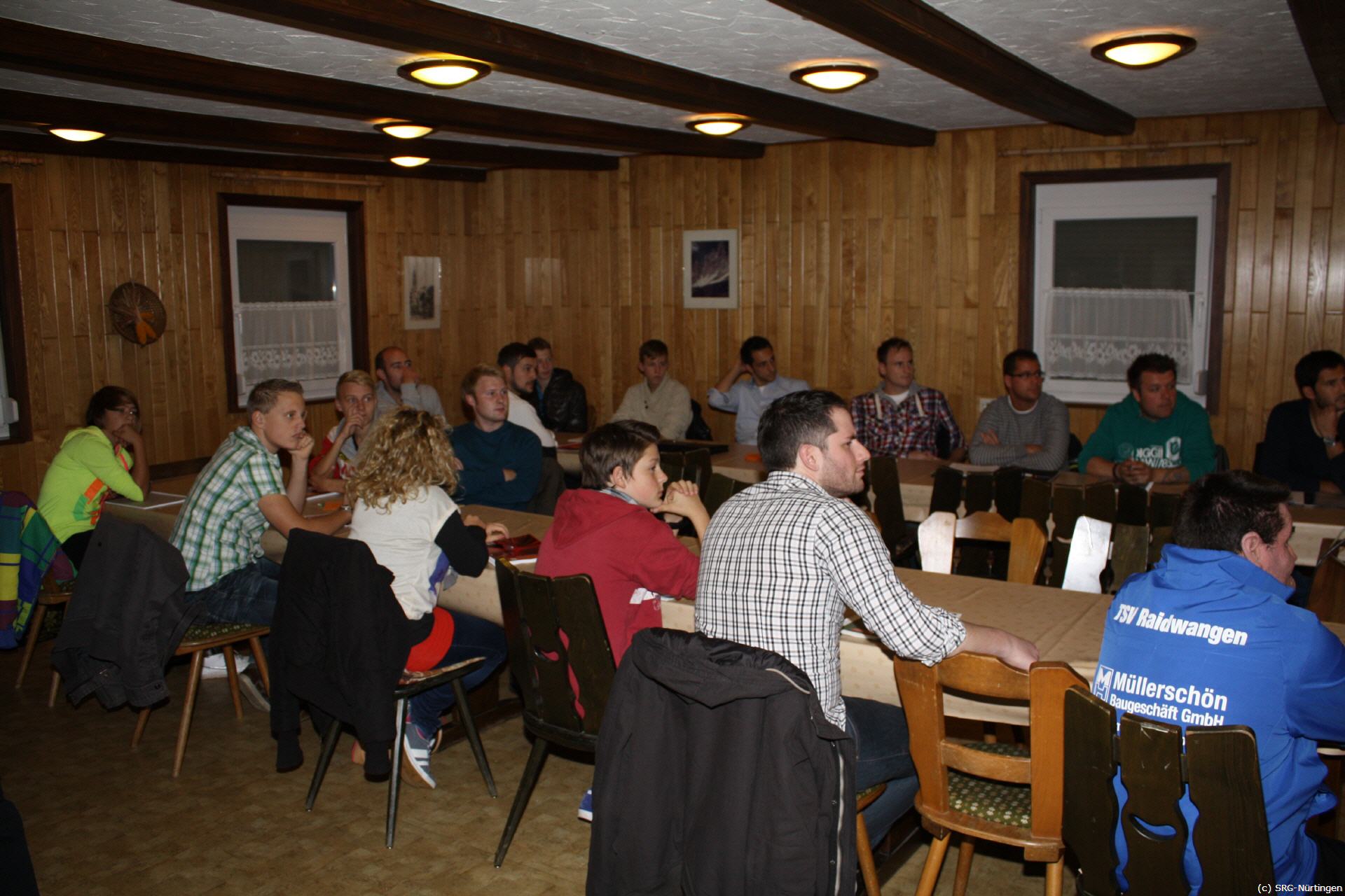 „Ein verletzter Spieler, der außerhalb des Feldes behandelt wird, läuft unangemeldet auf den Platz und schlägt daraufhin einen Gegenspieler im eigenen Strafraum. Welche Entscheidungen muss der SR treffen?“ Diese und andere Fragen wurden zwischen dem 6.11.12 und dem 23.11.12 von 18 Teilnehmern am Schiedsrichter-Neulingslehrgang der SR Gruppe Nürtingen diskutiert und vor allem auch gelöst. Unter den Anwärtern waren auch mehrere Bewerber für die Trainerlizenz sowie zwei Teilnehmer aus dem Nachbarkreis Esslingen. Sie alle nahmen am Lehrgang in der Holzhütte Pappelgarten des Skiclub Neckartailfingen teil. Neben der Antwort auf die obige Regelfrage (es erfolgt hier zunächst „rot“ für das Schlagen und natürlich Strafstoß) gab es zahlreiche weitere Überraschungen, die das scheinbar doch so einfache Regelwerk bereithielt.